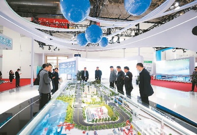 参观者在首届中国国际供应链促进博览会上观看沙盘模型。